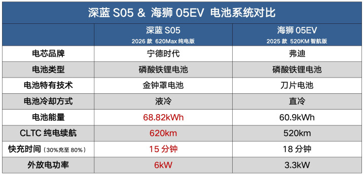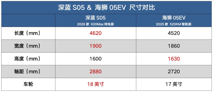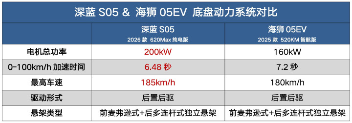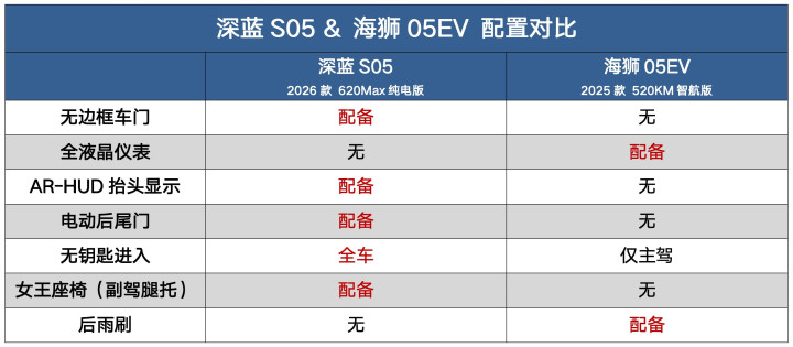 鉴于你们总是吐槽“汽车编辑每次都对比顶配版本,参考意义不大”,所以,本次我们选取了两款车型的中配版本,分别是指导价12.78万元的海狮05EV 2025款 520KM智航版和指导价13.99万元的深蓝S05 2026款 620Max纯电版。